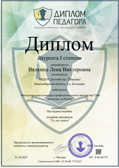 Диплом лауреата I степени международного конкурса профессионального мастерства " Они сражались за родину"21.10.25 г.